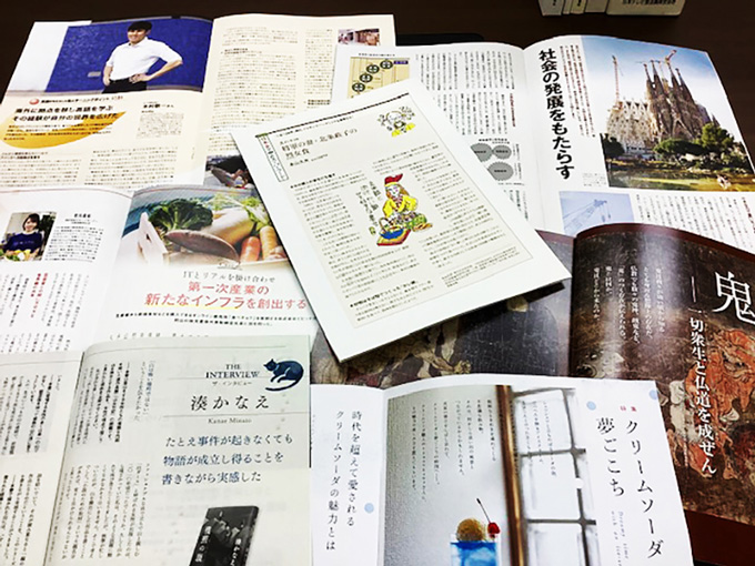 ●広報誌:「トランヴェール」東日本旅客鉄道「ていくおふ」ANA総合研究所「ハーモニー」三機工業「BEST BOOK」住友生命「長寿社会グローバルインフォメーションジャーナル」国際長寿センター「SMBCマネジメントプラス」SMBCコンサルティング「互助会通信」全日本冠婚葬祭互助協会 等